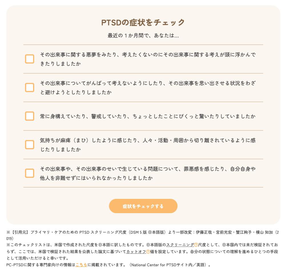 国立精神・神経医療研究センター 認知行動療法センターが運営する情報サイト(外部リンク)では、PTSDをセルフチェックできるリストを公開していますので、参考にしてみてください。
